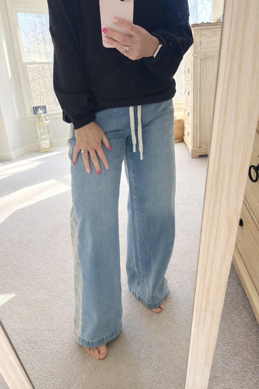 Are you like so many others that can't get enough of leopard print? If so, you need to add these jeans to your closet asap. They feature a wide leg style, elastic waist with metal ends on the drawstring, subtle leopard print going down the side of the legs and 4 functional pockets - 2 in the front and 2 in the back. These jeans are a great, luxe denim that you won't be able to get enough of.