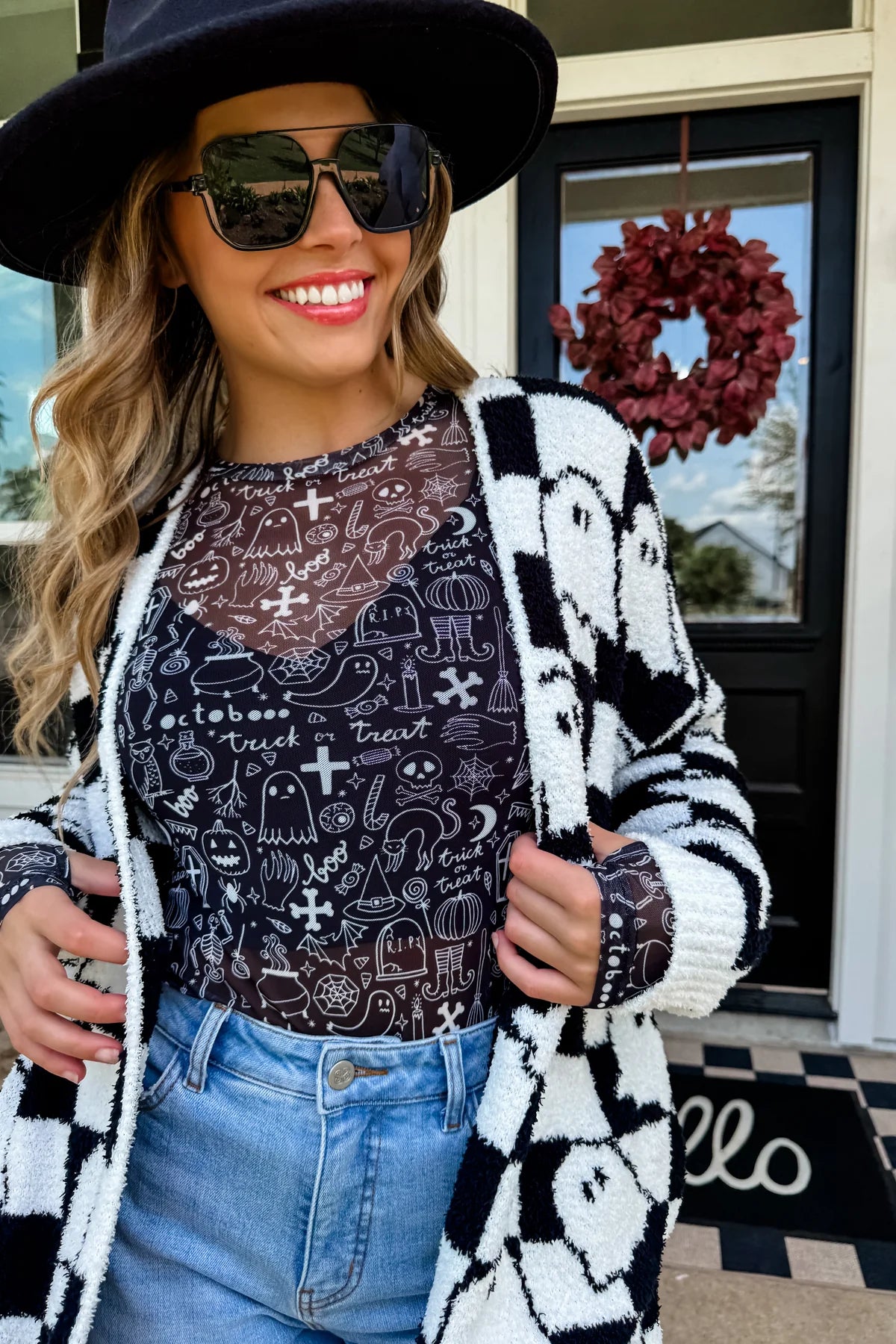 These new Halloween Mesh Tops are HERE!!! Stretchy mesh print long-sleeve top features a totally sheer design. Perfect for layering or worn alone. Pairs great under our new Halloween Cloud Cardigans too! Crew neck and thumbhole details sleeves.