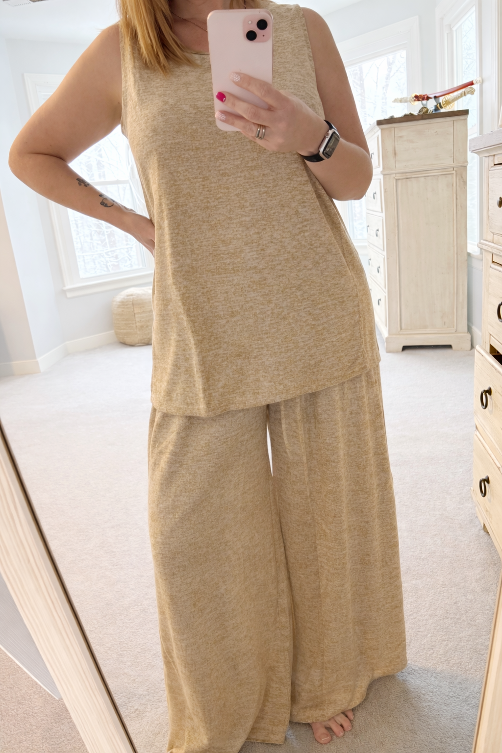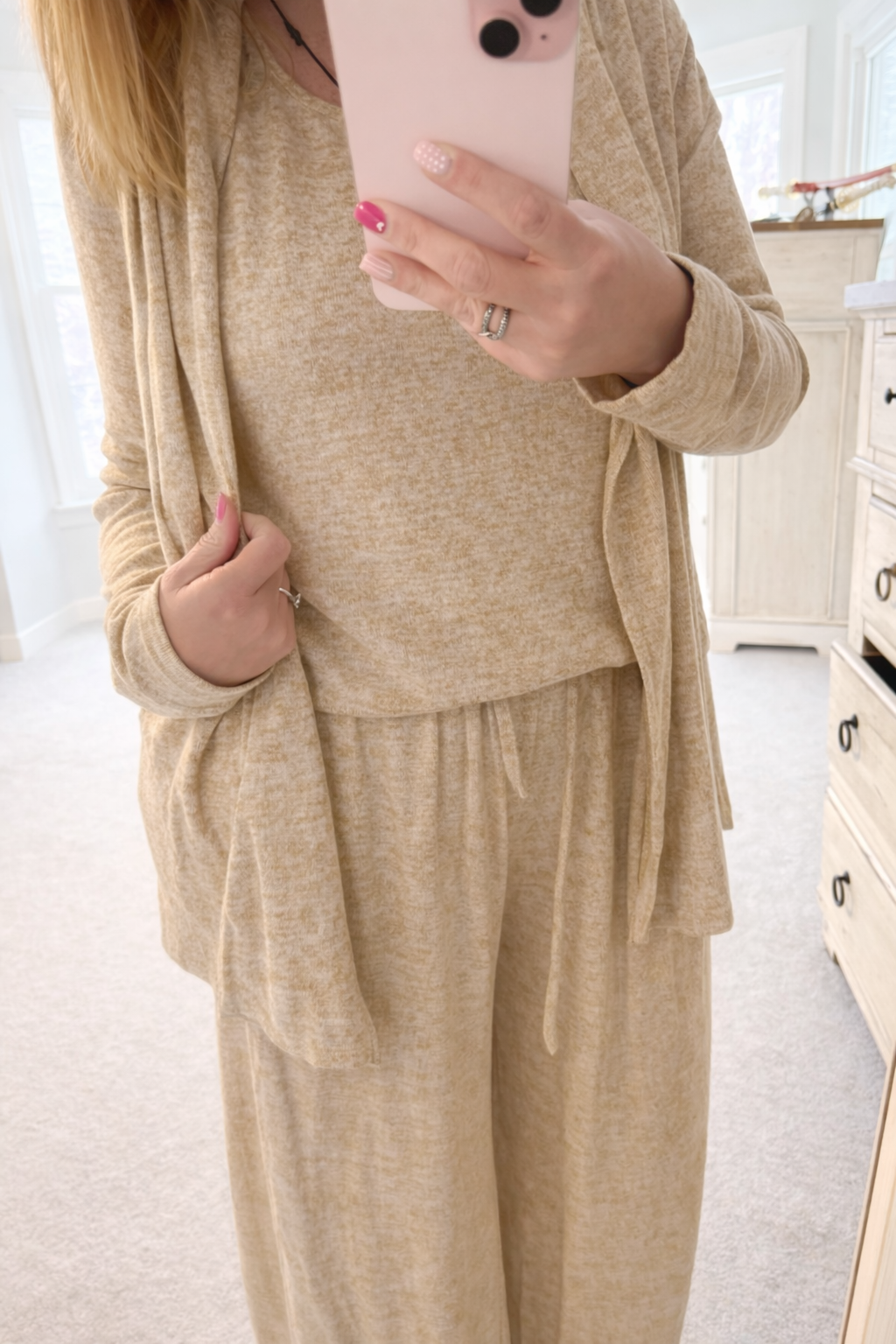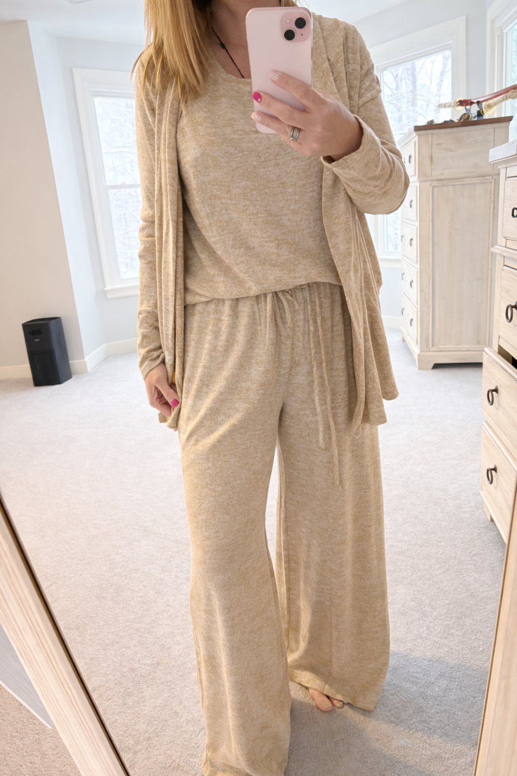 Think coffee, quiet mornings and lounging in this beautiful set. This set is very versatile. Wear it to lounge, traveling, to the office, date night or running errands. Features 3 pieces that you can wear together or mix and match with your favorite pieces. Features soft brushed, hacci/cashmere fabric. Cardigan features pockets.