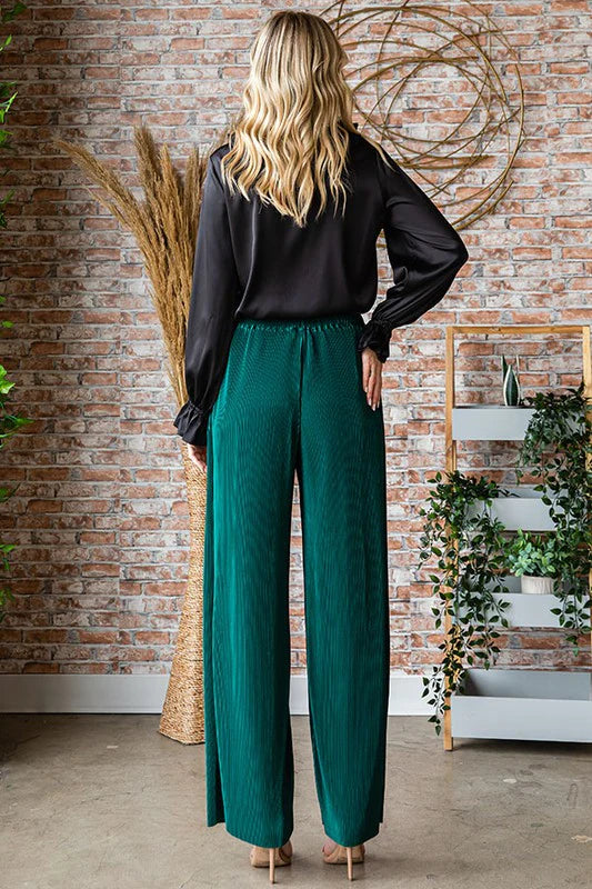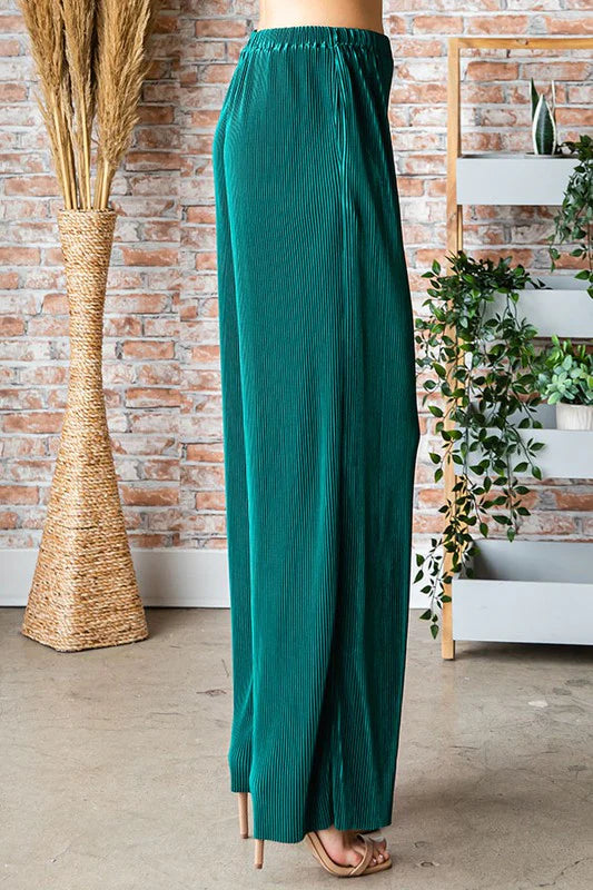 These ribbed silky pants in a rich hunter green shade offer a perfect blend of style and comfort. Ideal for Christmas parties, their roomy fit ensures ease of movement while the soft, smooth fabric feels luxurious against the skin. Versatile enough to be dressed up with heels or dressed down with flats, these pants feature convenient pockets for added functionality without compromising elegance.